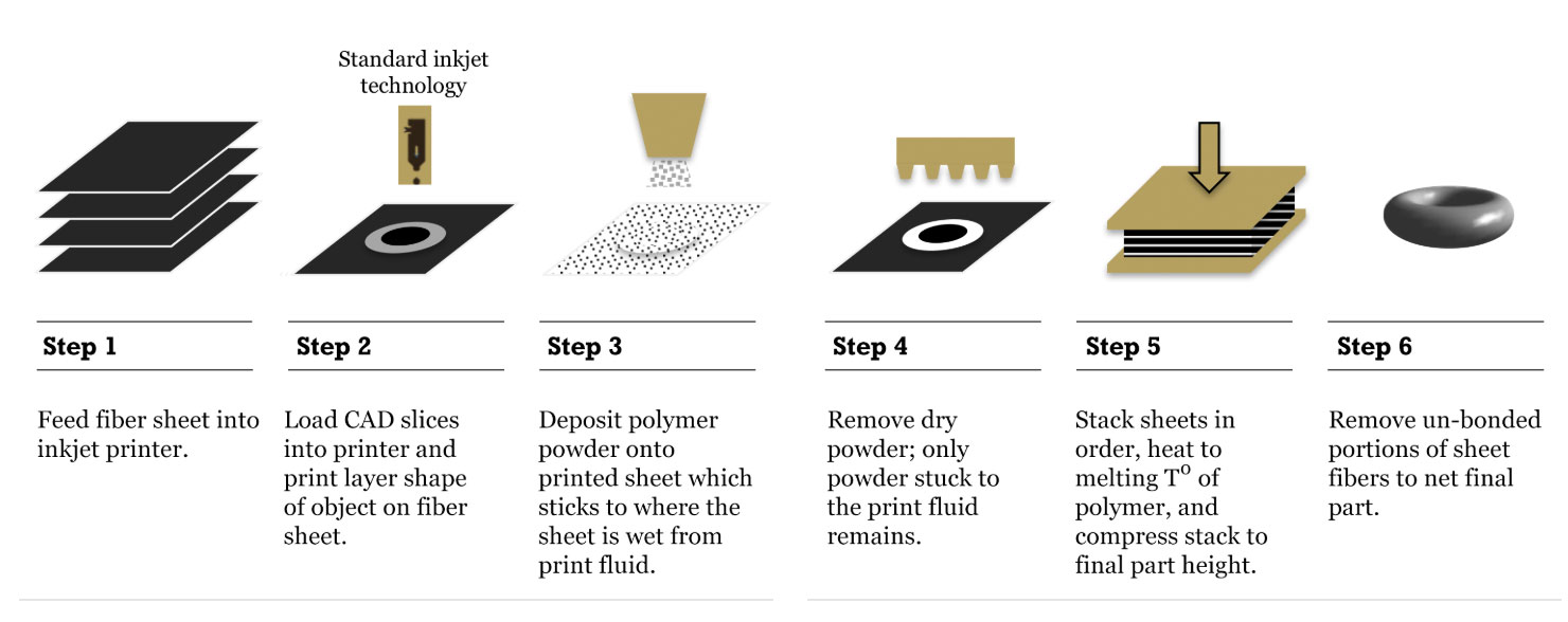 The process starts with a sheet of long-strand carbon fiber or fiberglass; each sheet becomes a layer of the final object after a cross-section of inkjet binder is sprayed onto it and it’s coated with a polymer powder. The polymer binds to the jetted cross-section and any excess is vacuumed away. All of the sheets are stacked, compressed, and then heated to the melting temperature of the polymer, causing each layer to melt together. Finally, the stack is sandblasted to remove the surrounding unused fibers. The result is a polymer-fiber composite part that’s significantly stronger than most 3D printed parts. The CBAM-2 can make carbon fiber and fiberglass composite objects using PEEK, Nylon, and many other industrial-grade polymers, and it can do it up to ten times faster than other 3D printing technologies at 45 cubic inches per hour. There are plans to reclaim the unused fiber to make new sheets in the future.