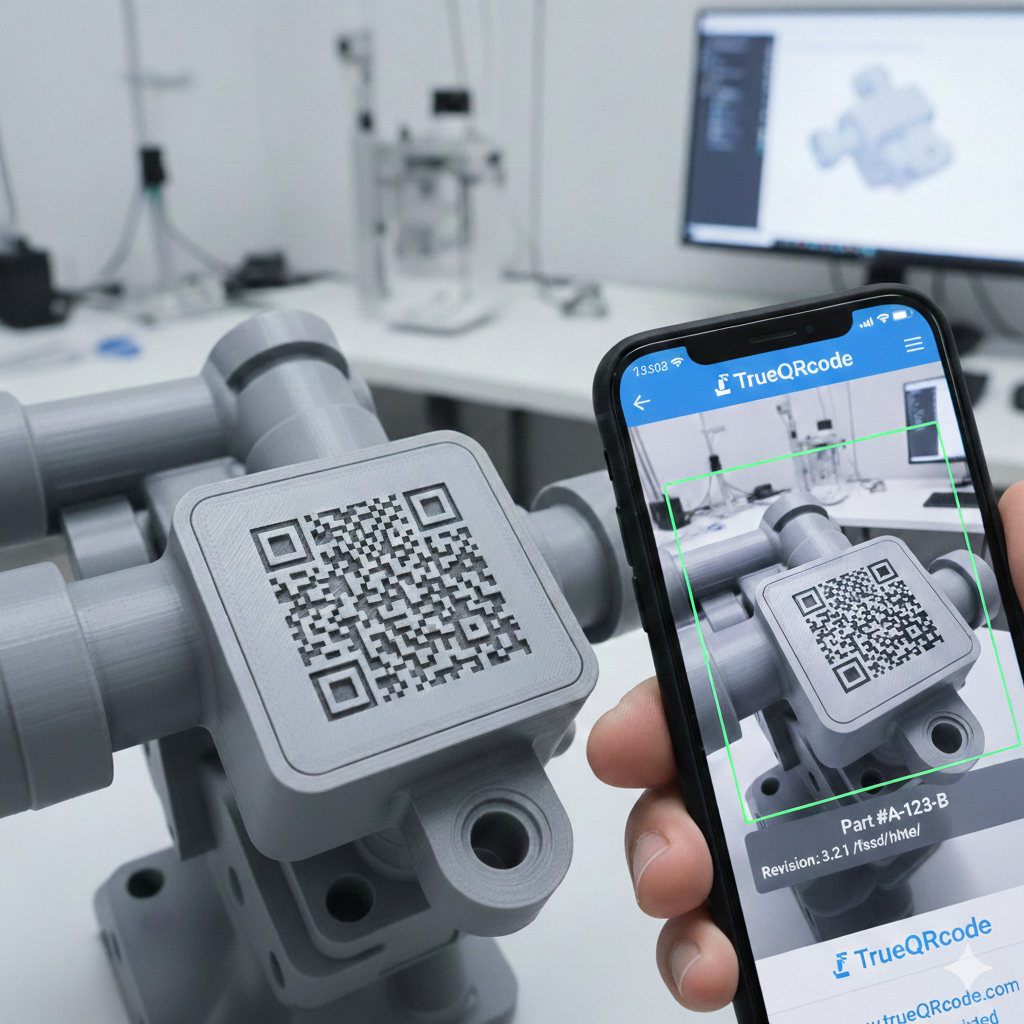 The workflow is simple: generate the QR geometry with a tool like QR2STL, boolean-merge the STL into your part in CAD, and print. The code cannot be rubbed off, peeled away, or misplaced.