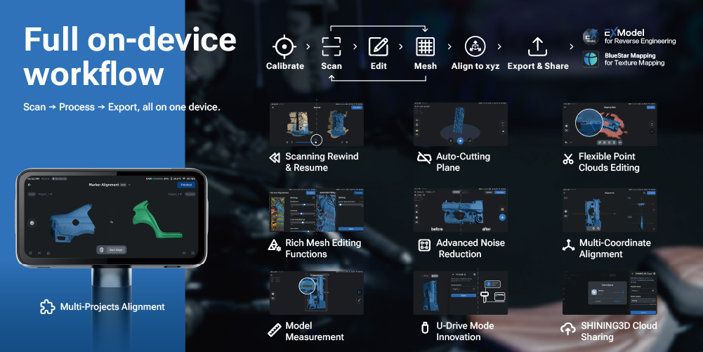 The Rigil Lite supports a complete scan-to-export workflow directly on the device, covering scanning, processing, and file export without needing to transfer data to a separate machine. For users who prefer PC-based work, the EXScan Rigil software provides a richer feature set through an intuitive unified interface, designed to reduce system load and improve overall performance.